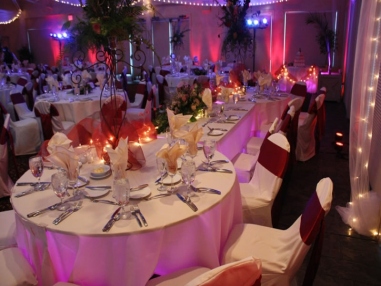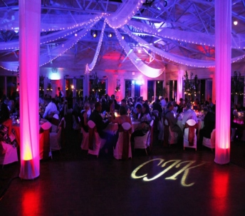 Lighting can change the dynamics of a room, almost all hotel banquet halls look the same. But throw lighting in the mix and you can have walls in your colors. Starlight Ceilings and the magic of clouds at your feet when you dance. Our lighting packages can accommodate the large elaborate tastes to the small intimate weddings some Brides and Grooms wish to have.